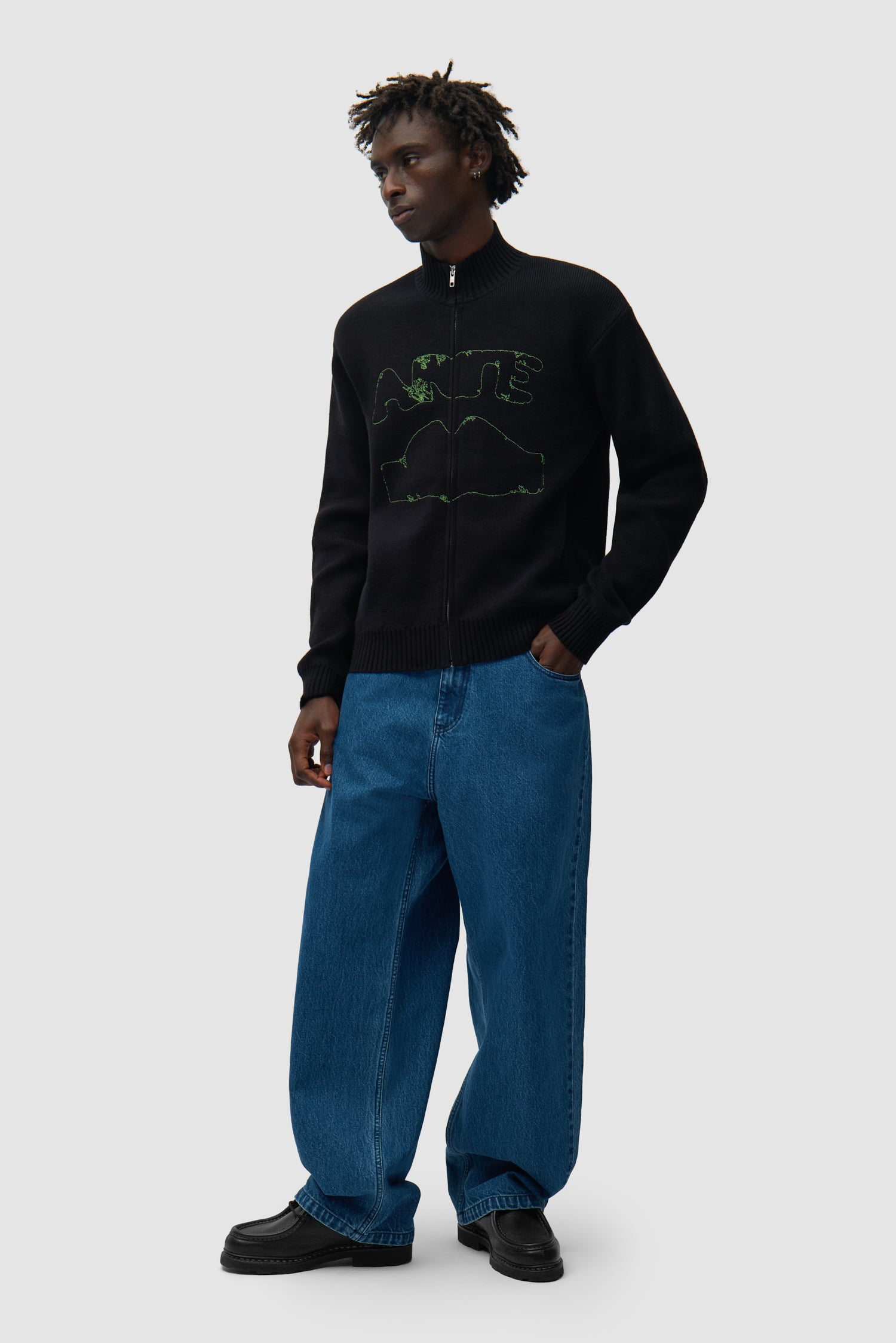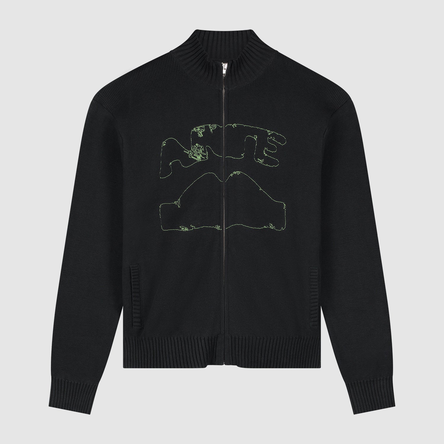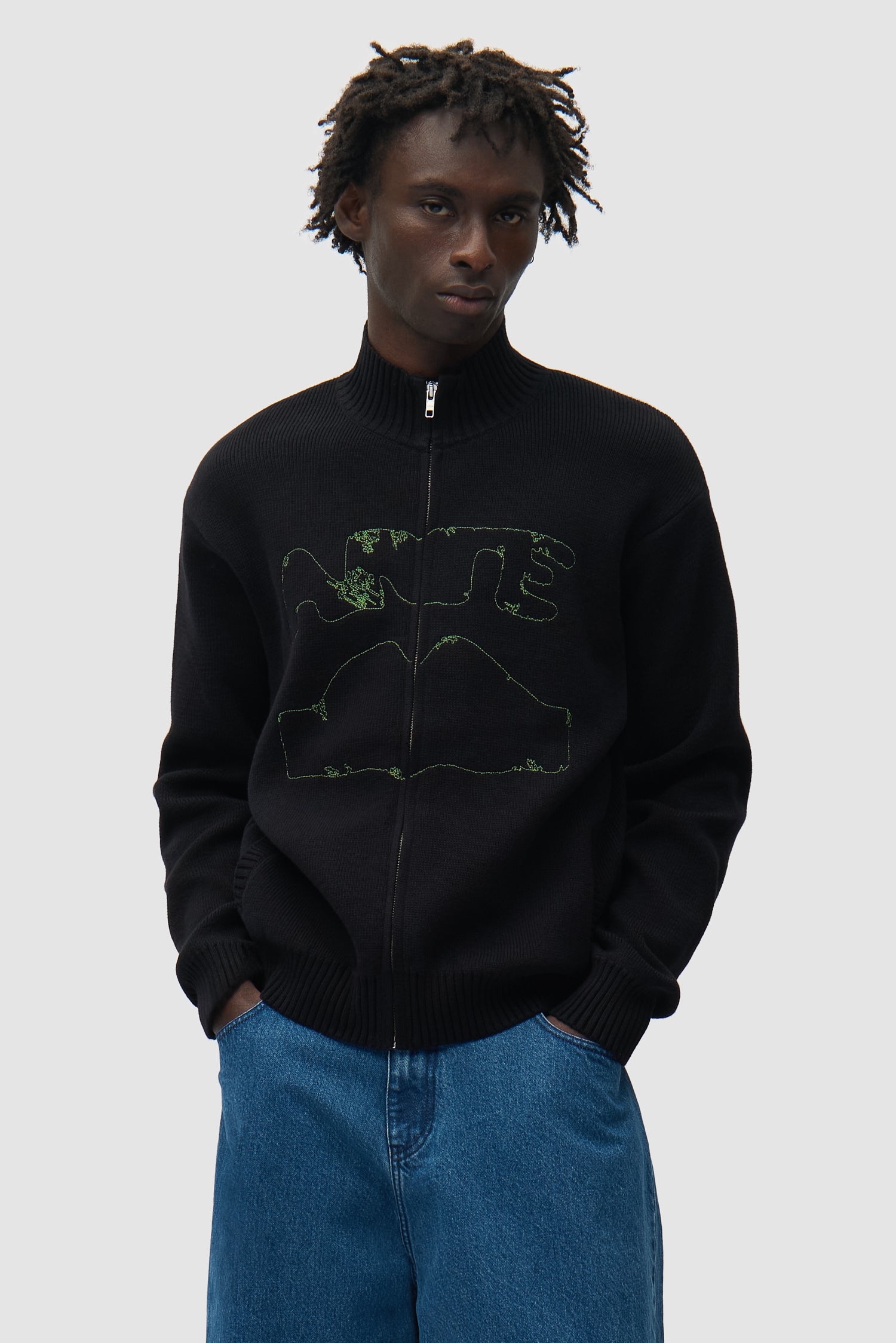 Confectionné dans un coton haut de gamme, ce cardigan vert olive arbore le motif graphique préféré de la communauté, légèrement déformé, brodé en vert sur la poitrine. Ce modèle en maille est doté de deux poches latérales, de bordures côtelées et d’une fermeture éclair sur toute la longueur.