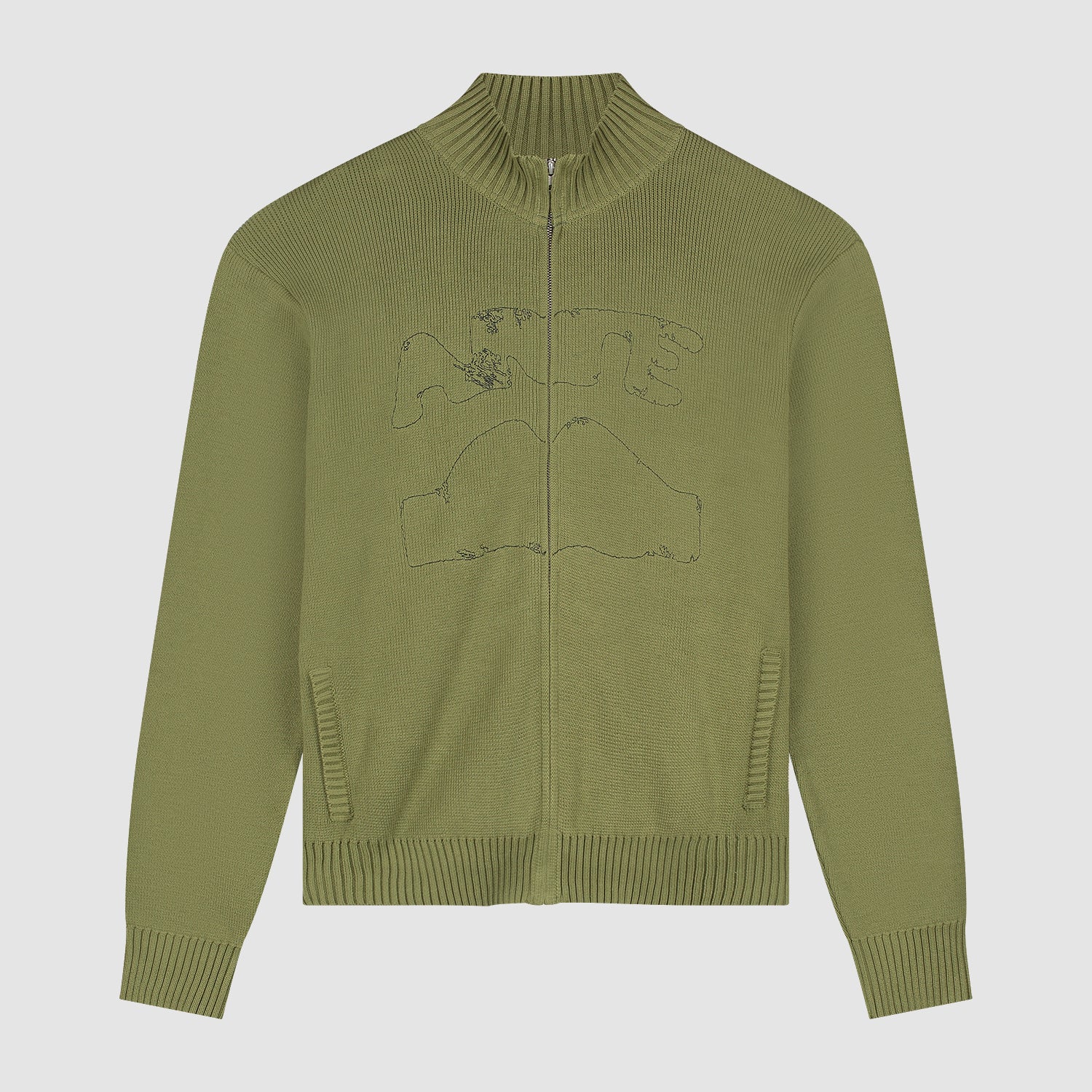 Confectionné dans un coton haut de gamme, ce cardigan vert olive arbore le motif graphique préféré de la communauté, légèrement déformé, brodé sur la poitrine. Ce modèle en maille est doté de deux poches latérales, de bordures côtelées et d’une fermeture éclair sur toute la longueur.