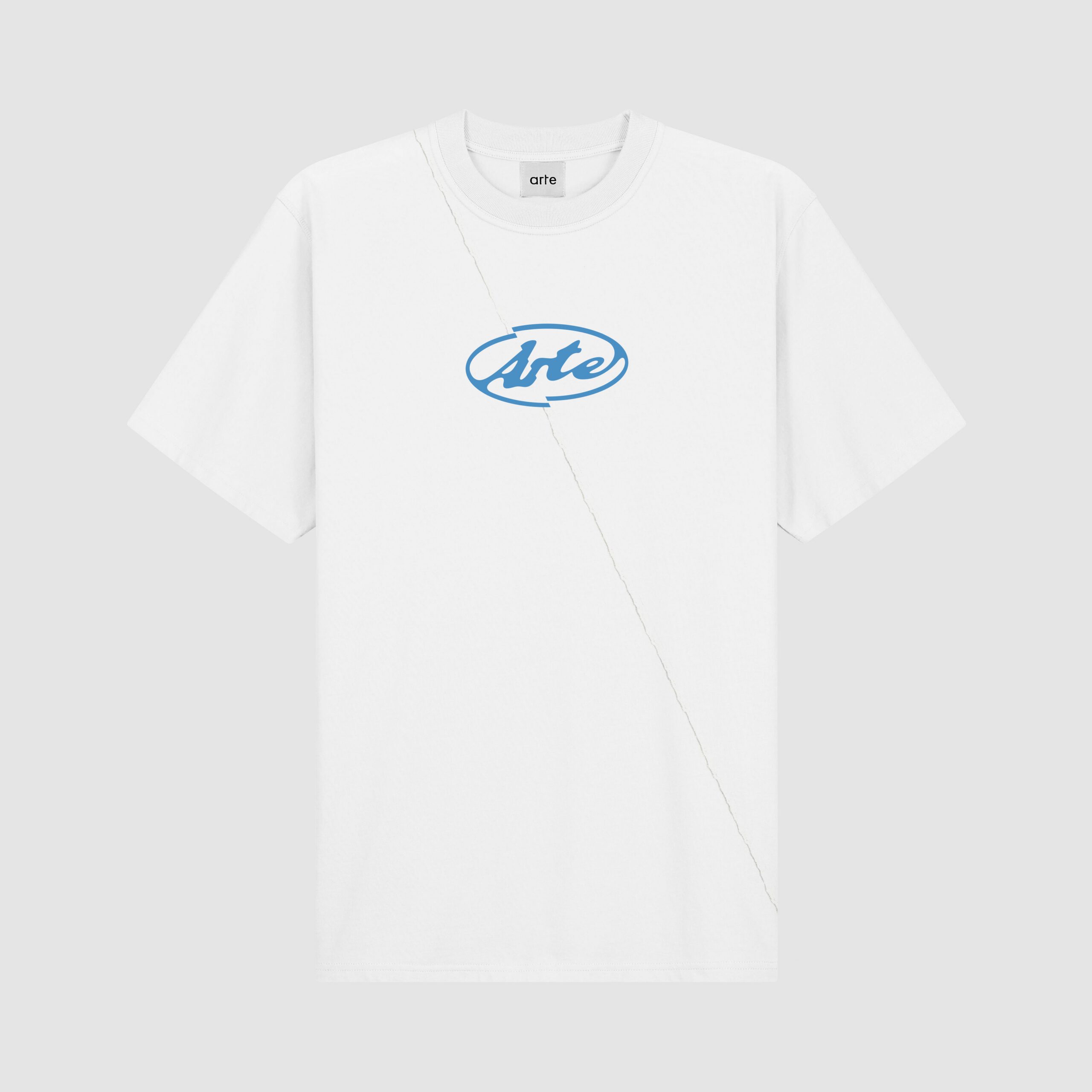 Le t-shirt arbore un logo Arte saisonnier sérigraphié en bleu sur la poitrine. Le motif est divisé par une couture qui traverse le t-shirt en diagonale. reprenant le thème de la collection. Confectionné dans un coton épais de qualité supérieure, ce t-shirt blanc présente un col légèrement plus haut et une coupe décontractée.