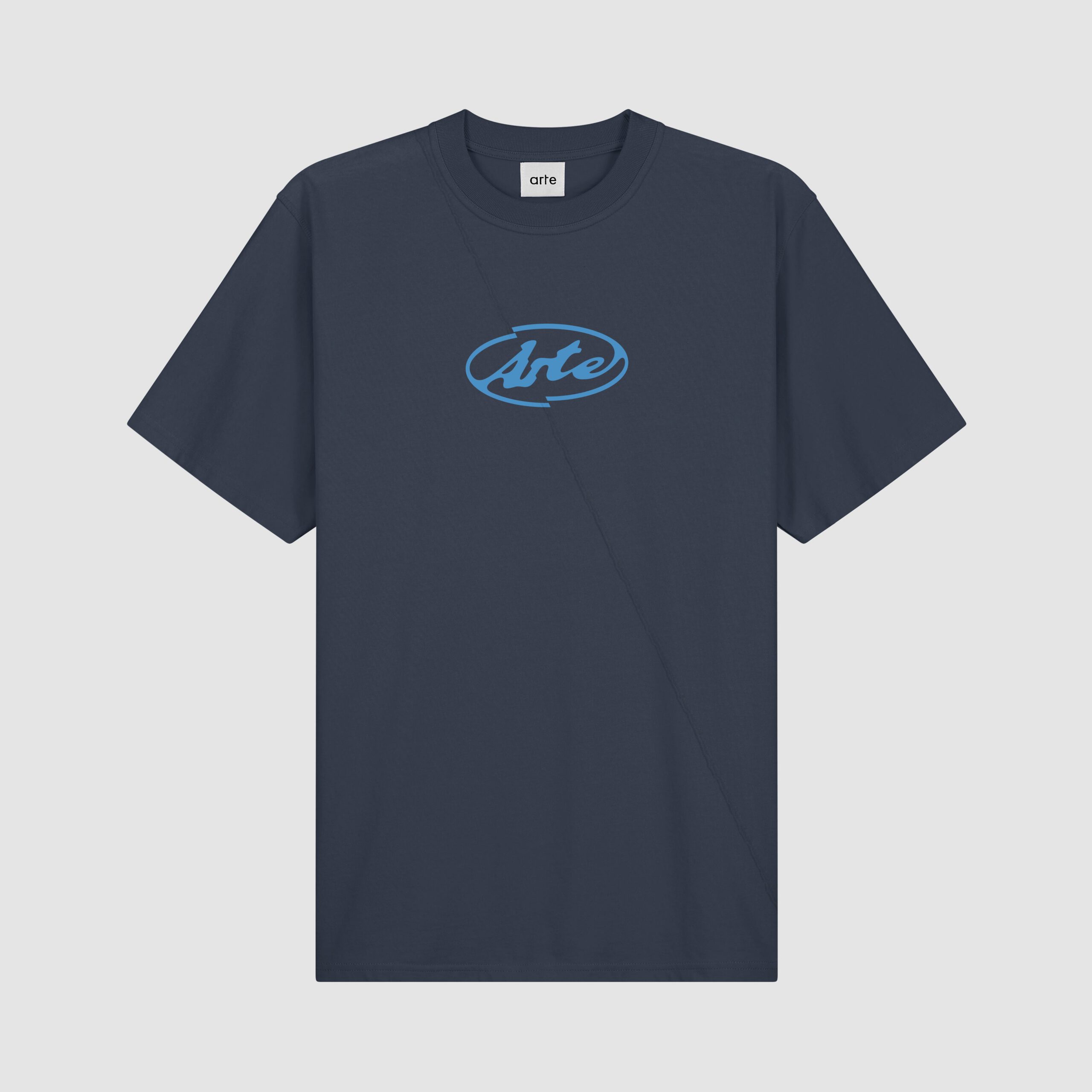 Le t-shirt arbore un logo Arte saisonnier sérigraphié en bleu sur la poitrine. Le motif est divisé par une couture qui traverse le t-shirt en diagonale. reprenant le thème de la collection. Confectionné en coton épais de qualité supérieure, ce t-shirt bleu marine présente un col légèrement plus haut et une coupe décontractée.