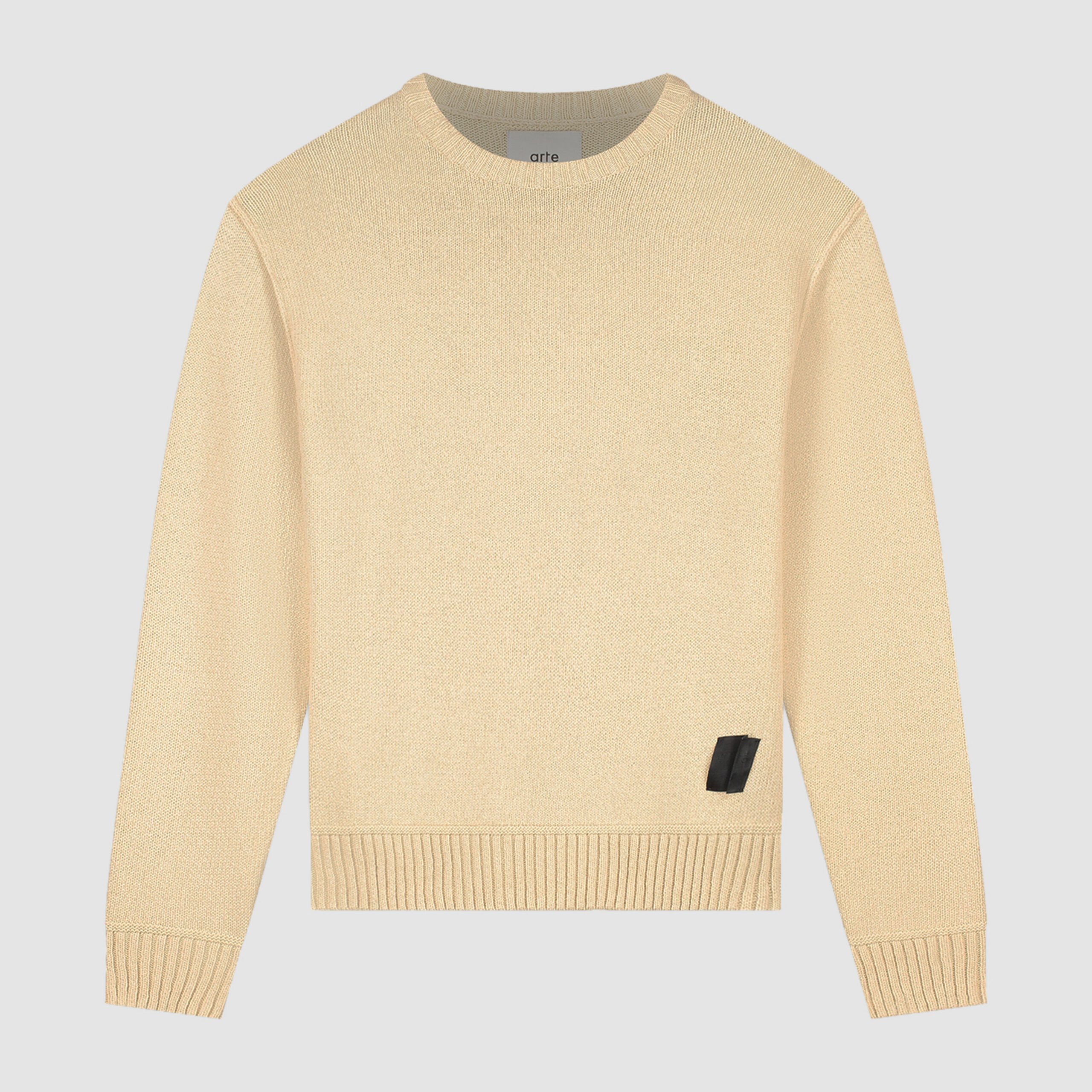 Le tricot est fabriqué à partir de coton épais de première qualité et présente un design réversible. reprenant le thème de la collection grâce à son look distinctif. Ce pull à col rond de couleur crème arbore plusieurs étiquettes de marque : d’un côté, une étiquette tissée noire déstructurée à l’ourlet et, de l’autre, l’étiquette tissée Arte caractéristique au niveau du col. Cette dernière est volontairement cousue à la main, ce qui permet de la retirer facilement. Les étiquettes d’entretien situées sur la couture latérale peuvent également être retirées, ce qui permet de porter le vêtement de manière réversible, sans coutures apparentes.