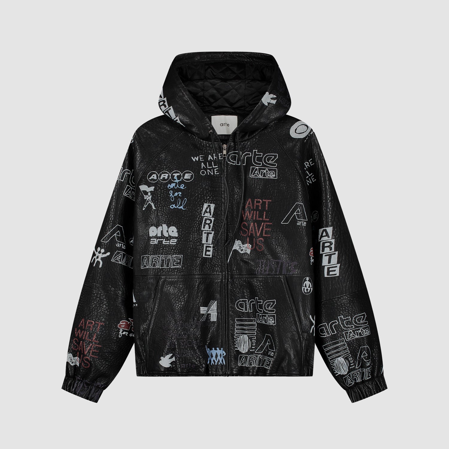 Confectionnée en cuir véritable haut de gamme, cette veste noire est un incontournable de la saison, ornée de différents logos et motifs Arte sérigraphiés sur toute sa surface. Reprenant le thème de la saison, cette veste est confectionnée en cuir véritable haut de gamme et dotée de deux poches latérales, d’une fermeture à glissière, d’une taille et de poignets élastiqués, ainsi que d’une capuche ajustable à l’aide de cordons pour un ajustement personnalisé.